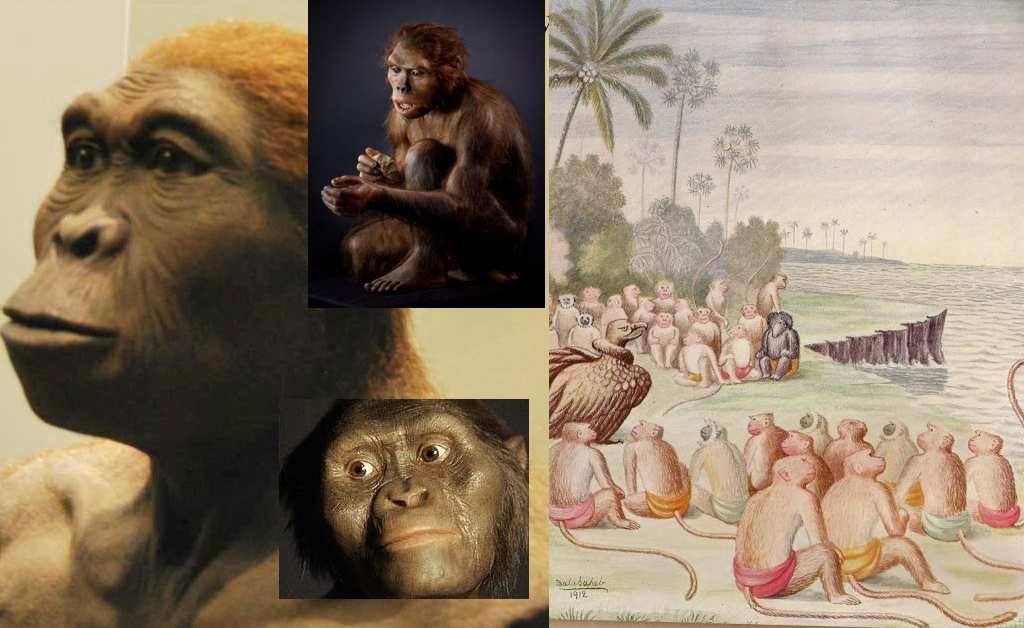 Izquierda: concepción artística de homo hábilis; Derecha: Concepción artística de los vanaras dialogando sobre como ayudar a Rama.